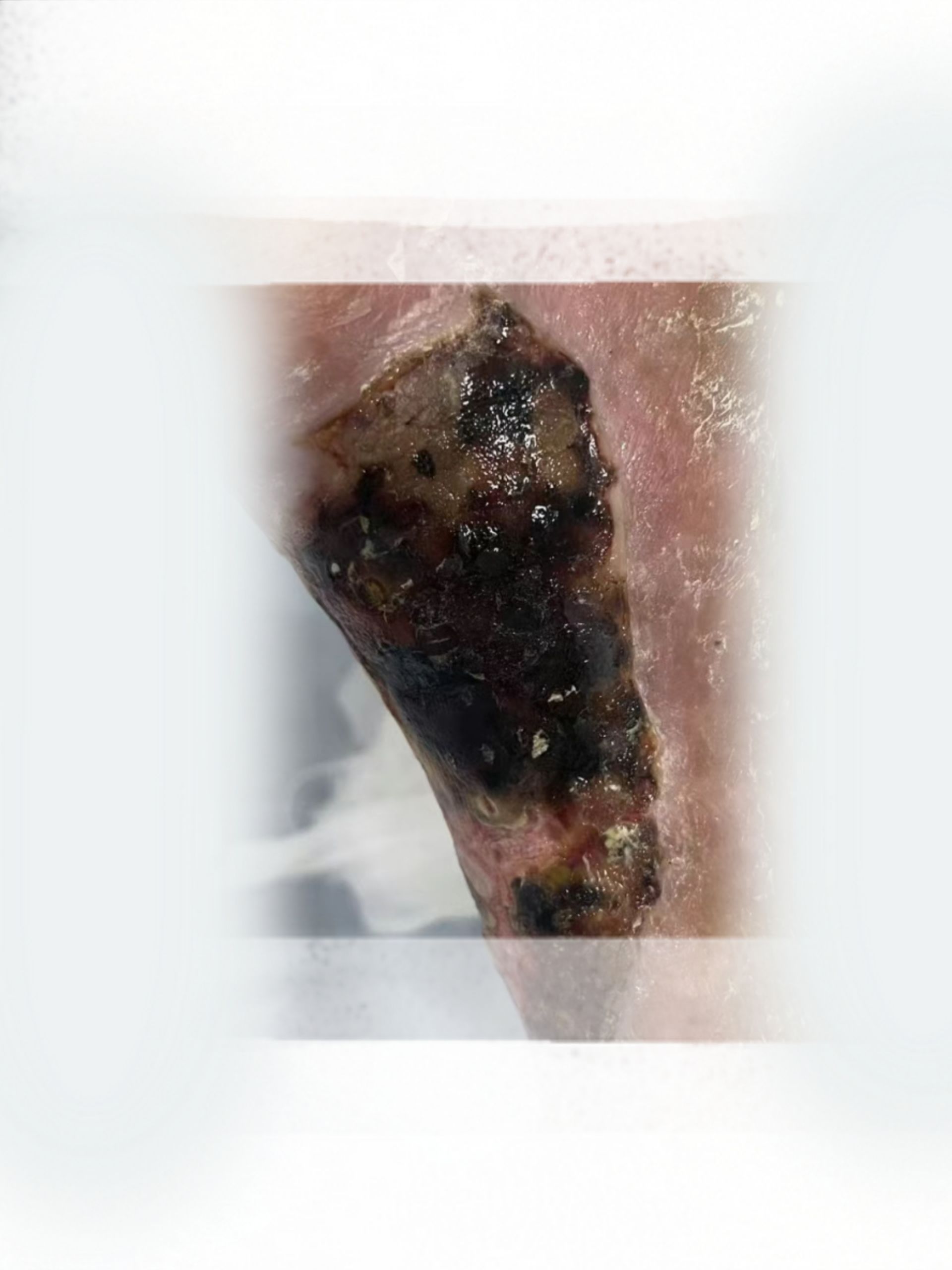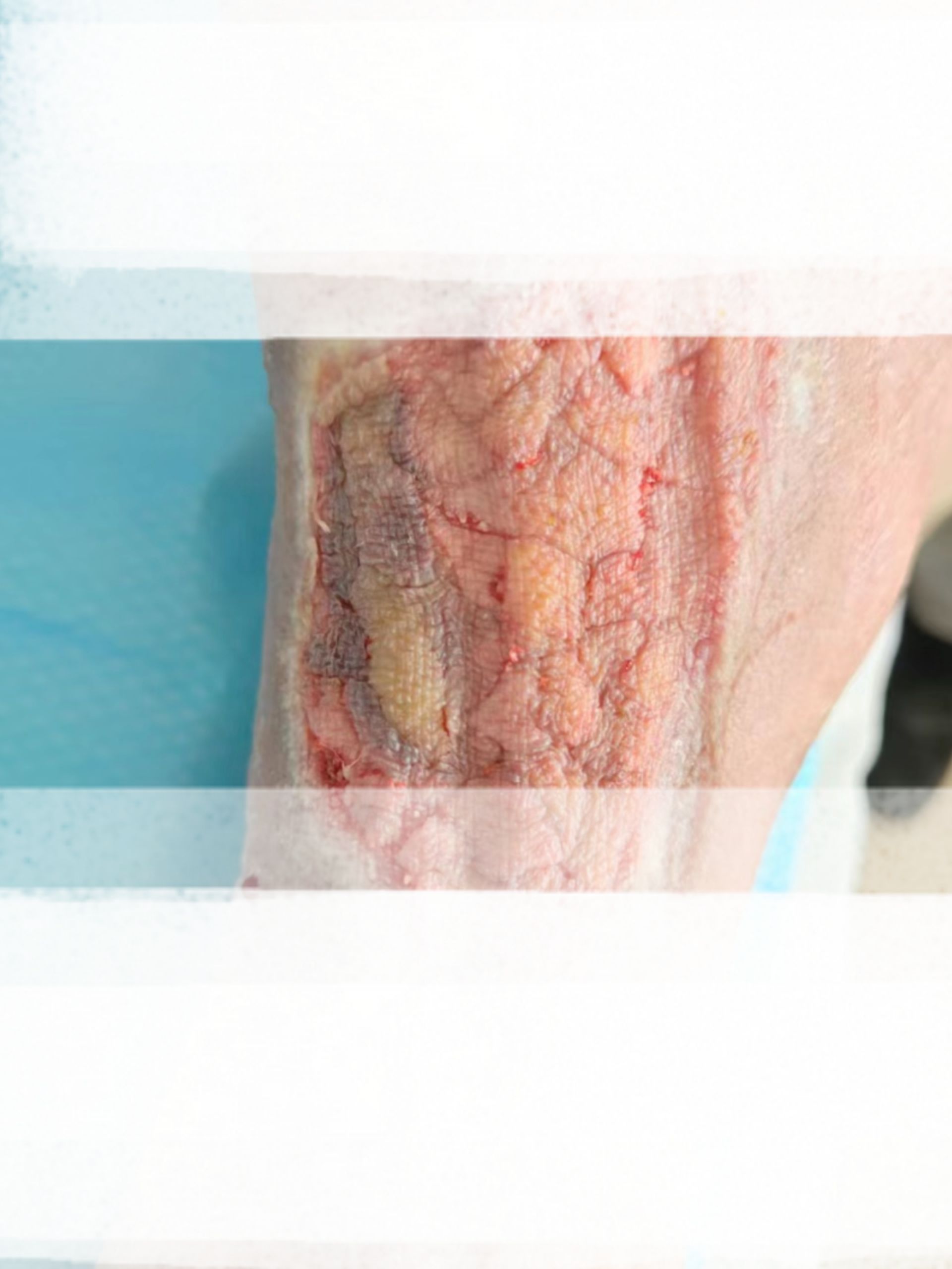 “您放心,既然信任我们,我们必定全力以赴!”接诊的吴学群第一时间为老人开展检查。检查结果显示:右小腿创面达10cm×8cm,深及肌层,跟腱明显暴露;实验室指标提示炎性指标显著升高,D-二聚体异常增高,存在血栓形成风险。吴学群当即组建以王盛副主任医师为核心,曾伯石、黄卓群主治医师及陈丽珊医师为骨干的专项治疗小组,同时启动多学科协作机制,为老人制定个体化救治方案。