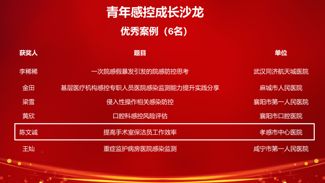 荆楚网(湖北日报网)讯(通讯员 陈军)近日,在华中科技大学同济医学院附属同济医院与国家重大公共卫生事件医学中心联合主办的“第一届同济感控学术会议”上,孝感市中心医院手术室护士陈文诚荣获“优秀青年感控学者”称号。由陈文诚主导的感控案例《提高手术室保洁人员工作效率》,在会议同期举办的第三届青年感控成长沙龙中表现出色,荣获“优秀案例”。
