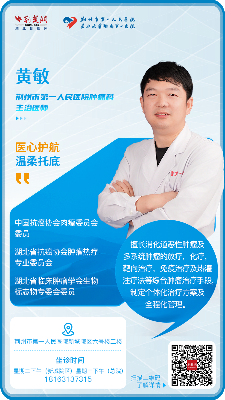 黄敏:荆州市第一人民医院肿瘤科主治医师,中国抗癌协会肉瘤委员会委员,湖北省抗癌协会肿瘤热疗专业委员会,湖北省临床肿瘤学会生物标志物专委会委员,湖北省抗癌协会肿瘤营养与代谢专业委员会青年委员。