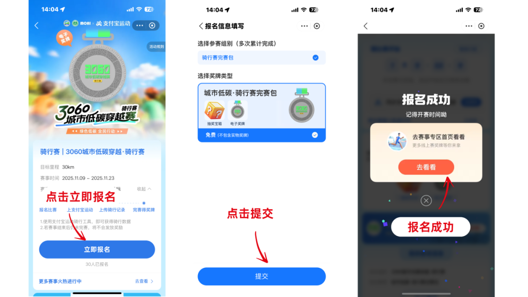 通过支付宝APP,搜索“支付宝运动”小程序进入“线上赛”专区报名参赛,或搜索“3060城市低碳穿越赛”小程序轮播页跳转报名。