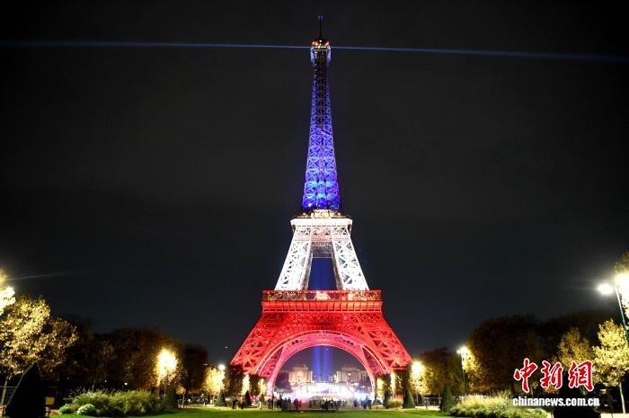 当地时间11月12日晚,巴黎埃菲尔铁塔点亮象征法国的亮红、白、蓝灯光,悼念十年前巴黎系列恐怖袭击的遇难者,表达国家团结。 中新社记者 李洋 摄