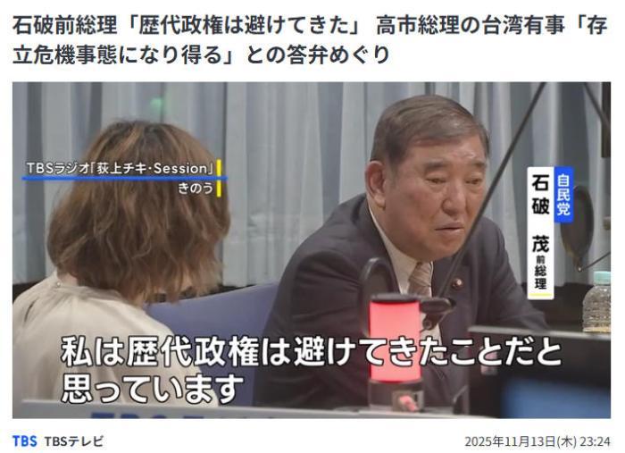 11月13日,日本前首相石破茂在TBS电台节目中,对高市的言论表示反对。