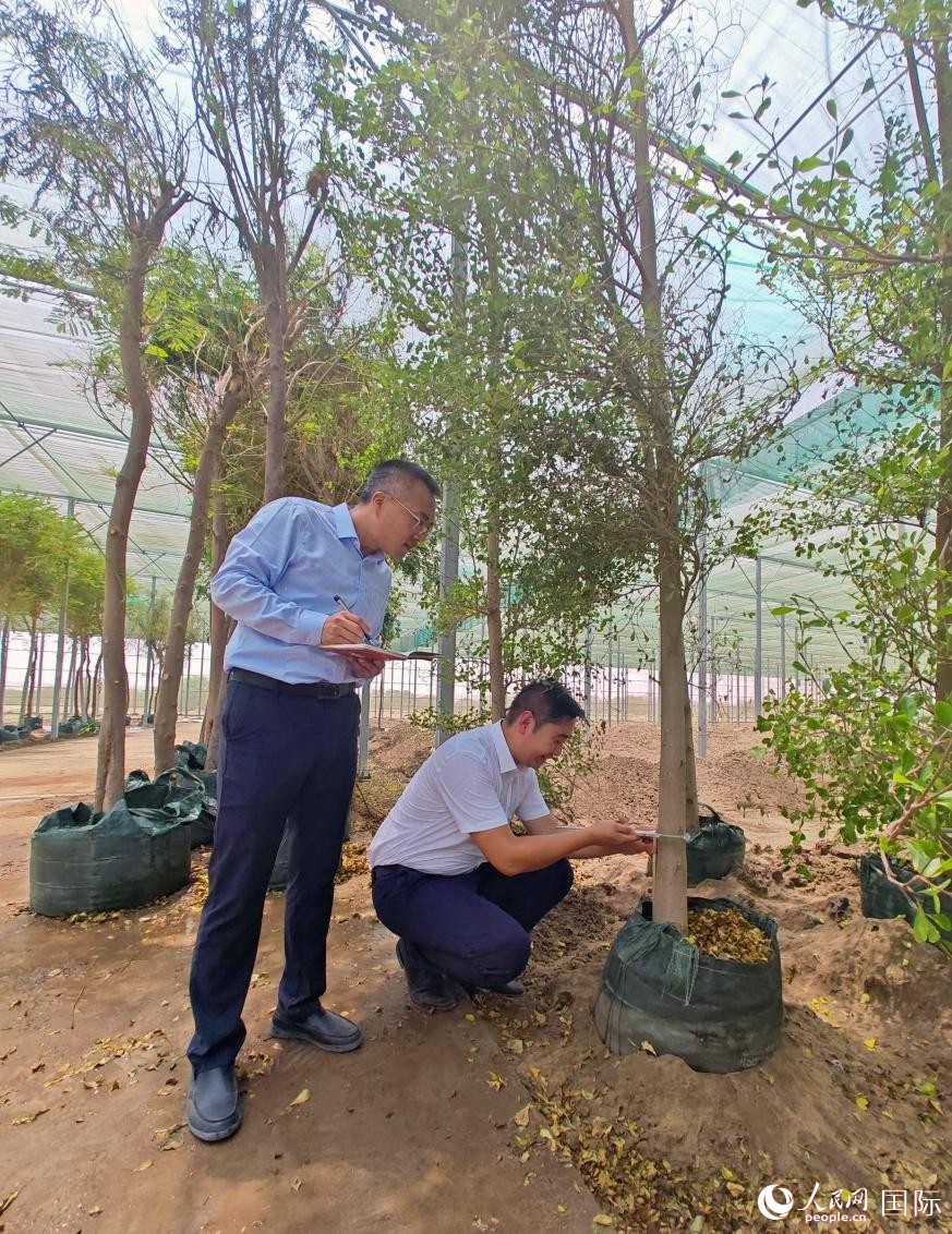 工作人员在检查绿植生长情况。人民网记者管克江摄