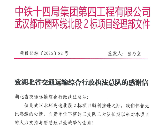 近日,湖北省交通运输综合行政执法总队收到一封来自中铁十四局集团第四工程有限公司的感谢信。信中,武汉都市圈环线北段2标项目部特意致谢总队高速公路路政执法三支队三大队,称赞其在项目施工审批、现场协调、交通疏导等关键环节的“全链条”靠前服务,以专业高效的举措为工程推进扫清障碍,让企业切实感受到服务速度与温度。