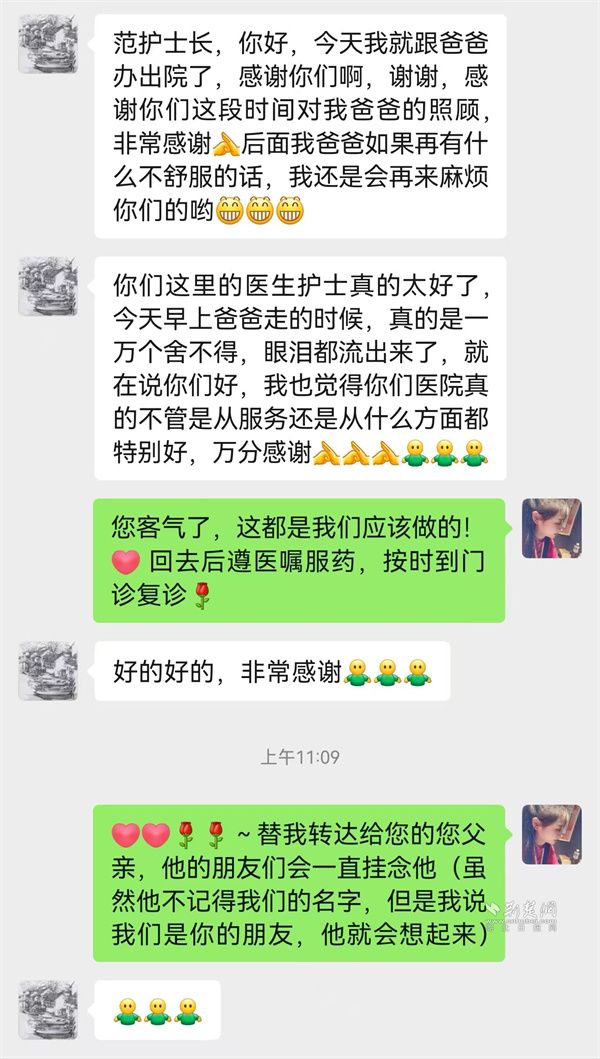 这份细致关怀,也深深印在患者和家属心里。患者蔡爹爹出院前,女儿特意给副护士长范美玲发来微信:“你们这里的医生护士真是太好了,爸爸在这住得比家里还舒心,你们比亲人还细心。今天早上离开的时候,他一万个舍不得,反复念叨着不想走。”