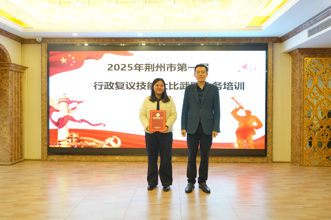 荆州市司法局党委委员、副局长邓春龙(右一)为获得团体组织奖的代表颁奖