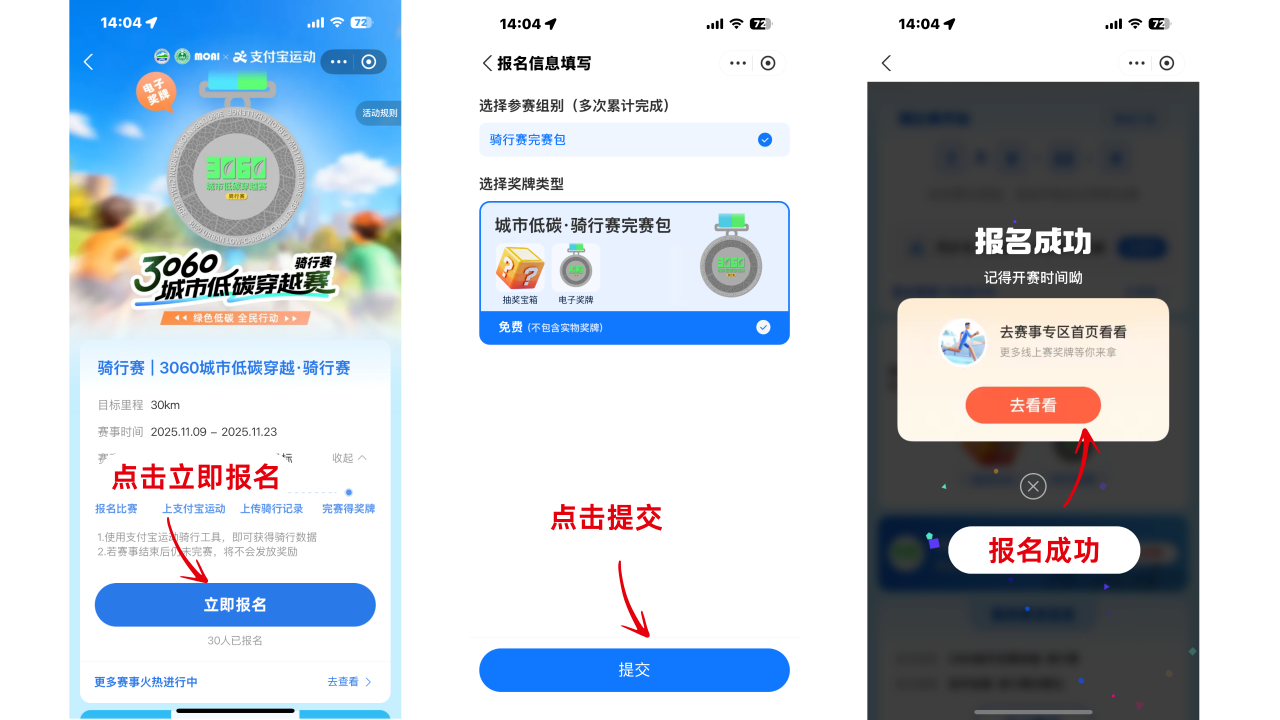 通过支付宝APP,搜索“支付宝运动”小程序进入“线上赛”专区报名参赛,或搜索“3060城市低碳穿越赛”小程序轮播页跳转报名。