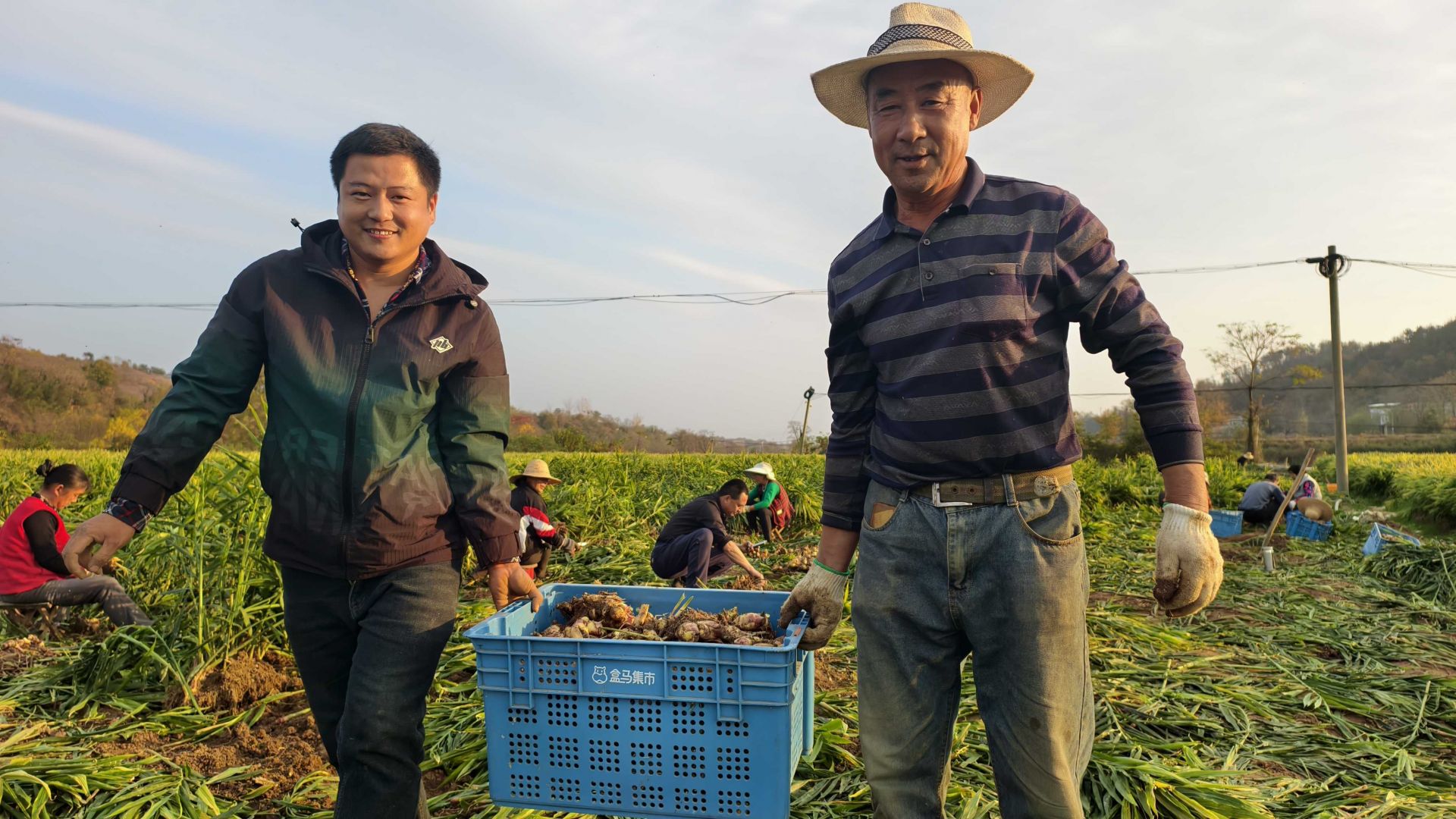 成片的姜田郁郁葱葱,出姜机轰隆作响,40余名村民穿梭其间,有条不紊地分拣、装筐,脸上洋溢着丰收的喜悦。