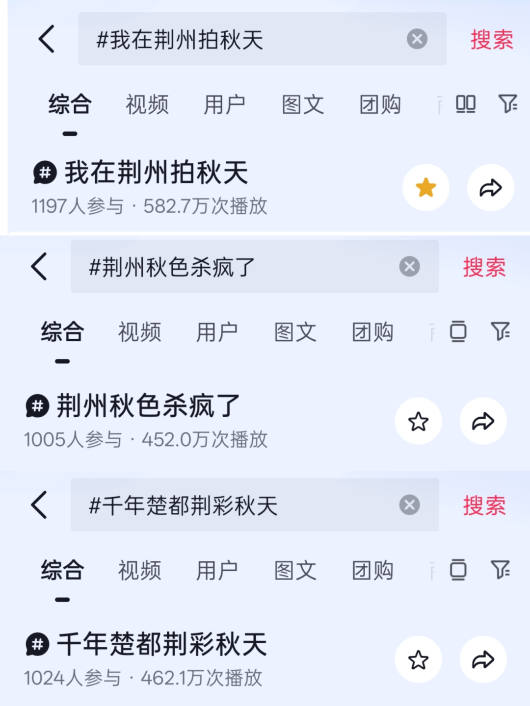 “千年楚都 ‘荆’彩秋天——荆州秋色全民推荐官短视频征集大赛”自11月8日启动以来短短10天,抖音平台“#我在荆州拍秋天”“#荆州秋色杀疯了”“#千年楚都荆彩秋天”,三大话题总播放量超过了1500万次,3000余人参与到活动中。小红书、视频号平台也收到全市各地不少粉丝投稿。