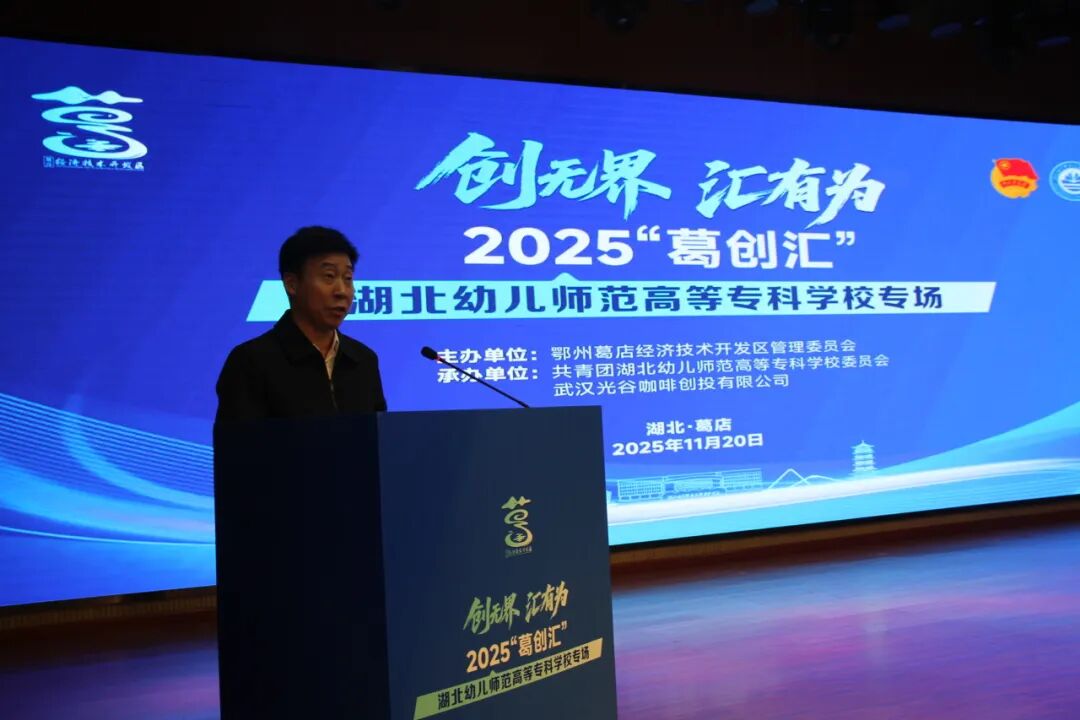 葛店国家经开区管委会副主任柳金旗在致辞中高度评价了湖北幼专在幼教人才培养与创新创业教育方面的特色实践。他表示,葛店开发区始终将高校作为区域创新的策源地与人才引擎,持续迭代"天天有咖啡、周周有路演、月月创投汇"的双创服务生态,为青年创业者提供全周期、专业化的成长支持。一直以来,葛店国家经开区致力于为追梦者提供最优渥土壤、最贴心服务、最广阔舞台,将全力发挥政策引导与平台枢纽作用,激活区域创新活力,推动更多优质项目落地生根、开花结果,让青年创新的"星星之火"在葛店这片产业热土上形成"燎原之势",为湖北建设全国构建新发展格局先行区贡献青春力量。