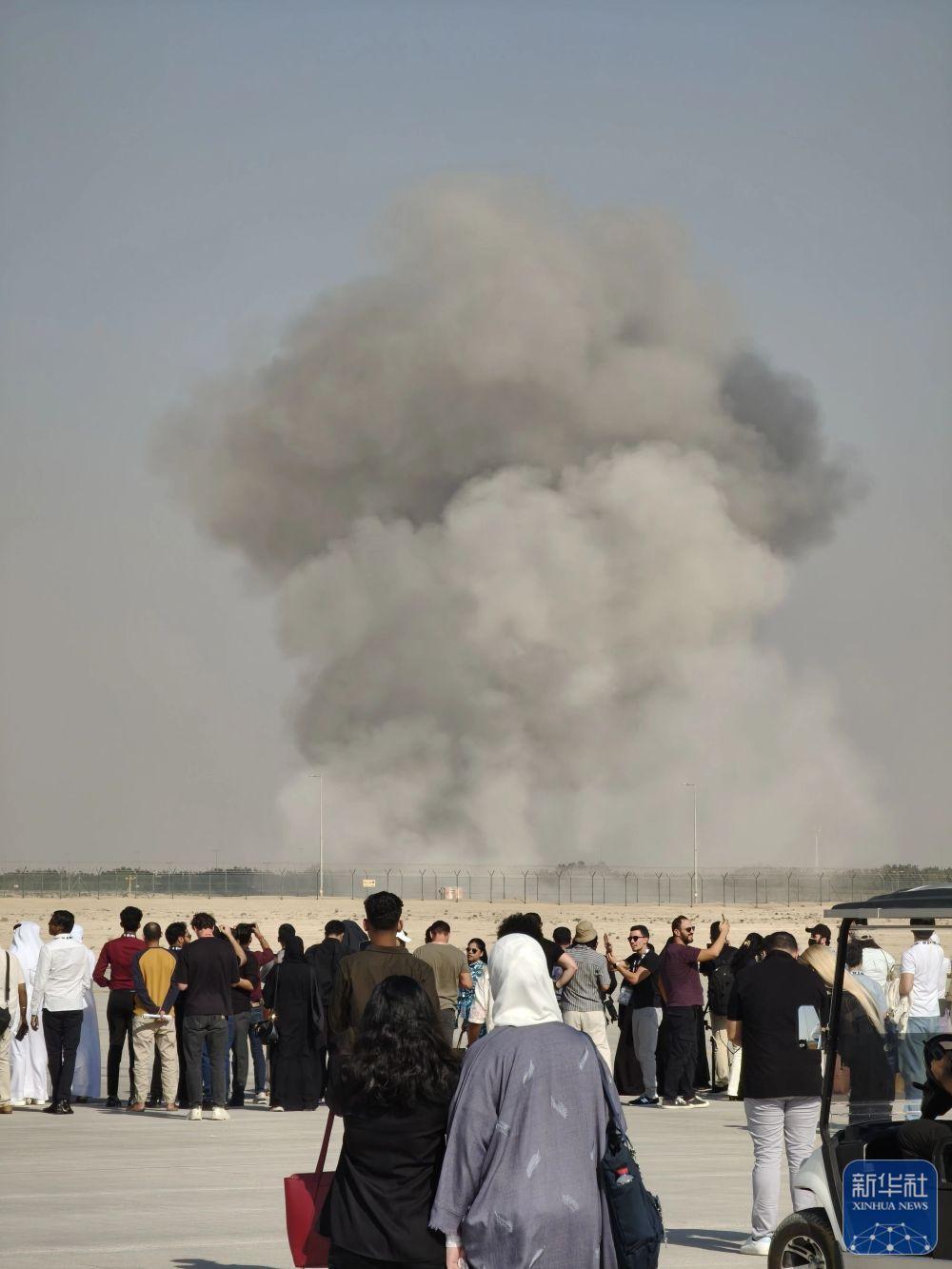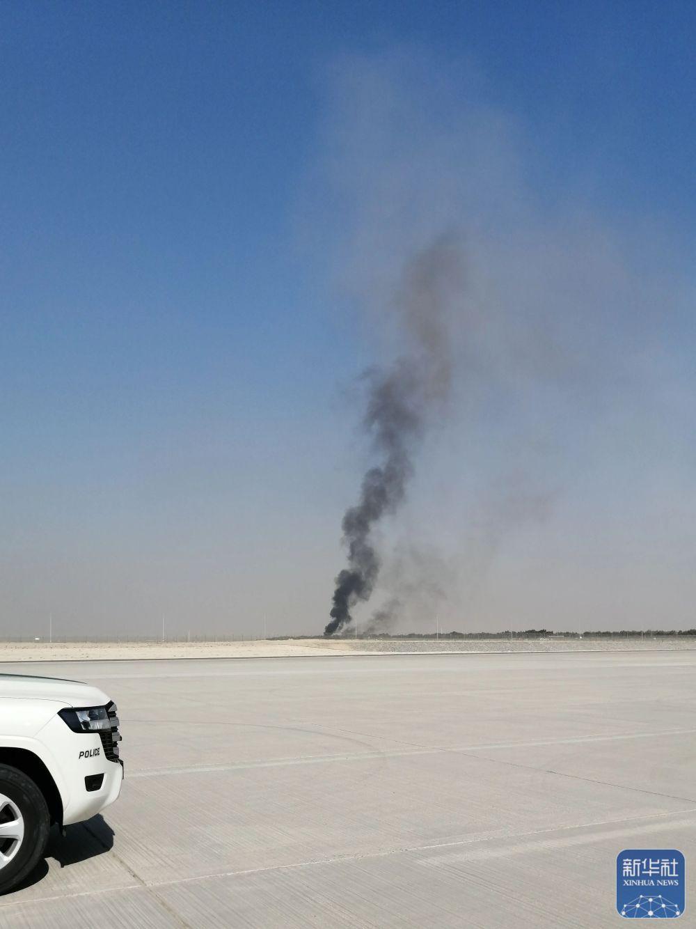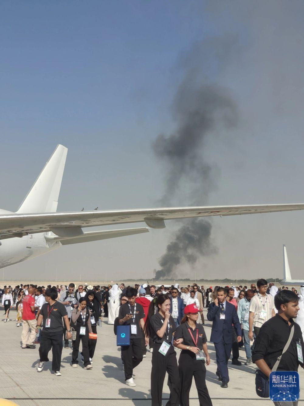 11月21日,在阿联酋迪拜,飞机坠毁现场冒出滚滚浓烟。
