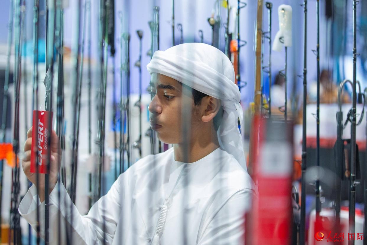 一位小观众在了解钓鱼装备。人民网 塔里克·易卜拉欣摄