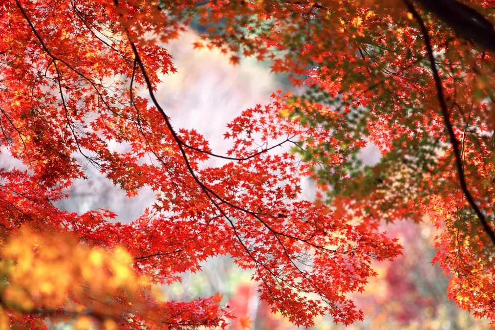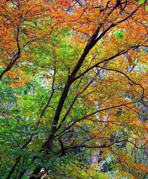 绵延的山谷像打翻的调色盘,红色是主调,其间点缀着金、橙和绿色,错落有致,构成一幅温暖的秋景长卷。