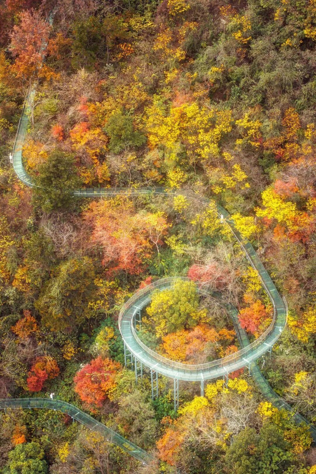 2.站在玻璃天桥俯拍脚下漫山红叶,捕捉云端漫步的惊险与美感。