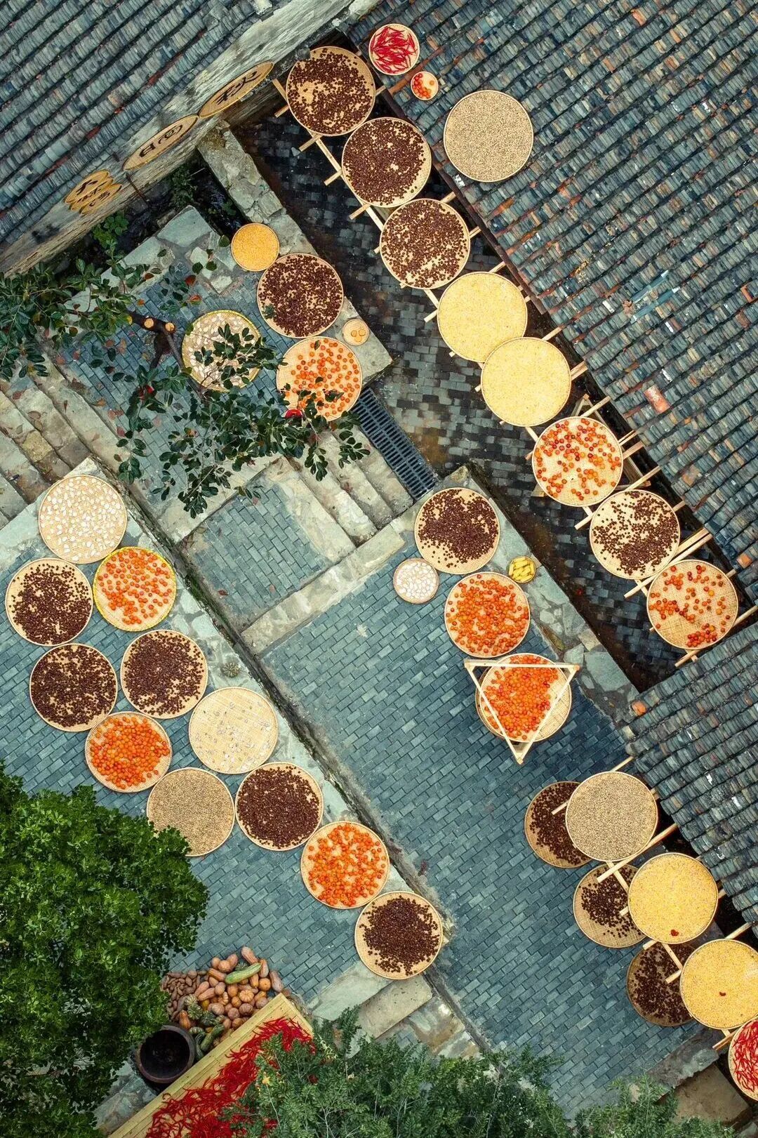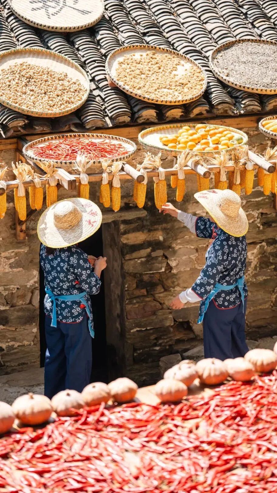 这不是摆设或表演,是真实的生活场景。家家户户门口摆放的竹匾里,晾晒的是他们一年劳作的收获。