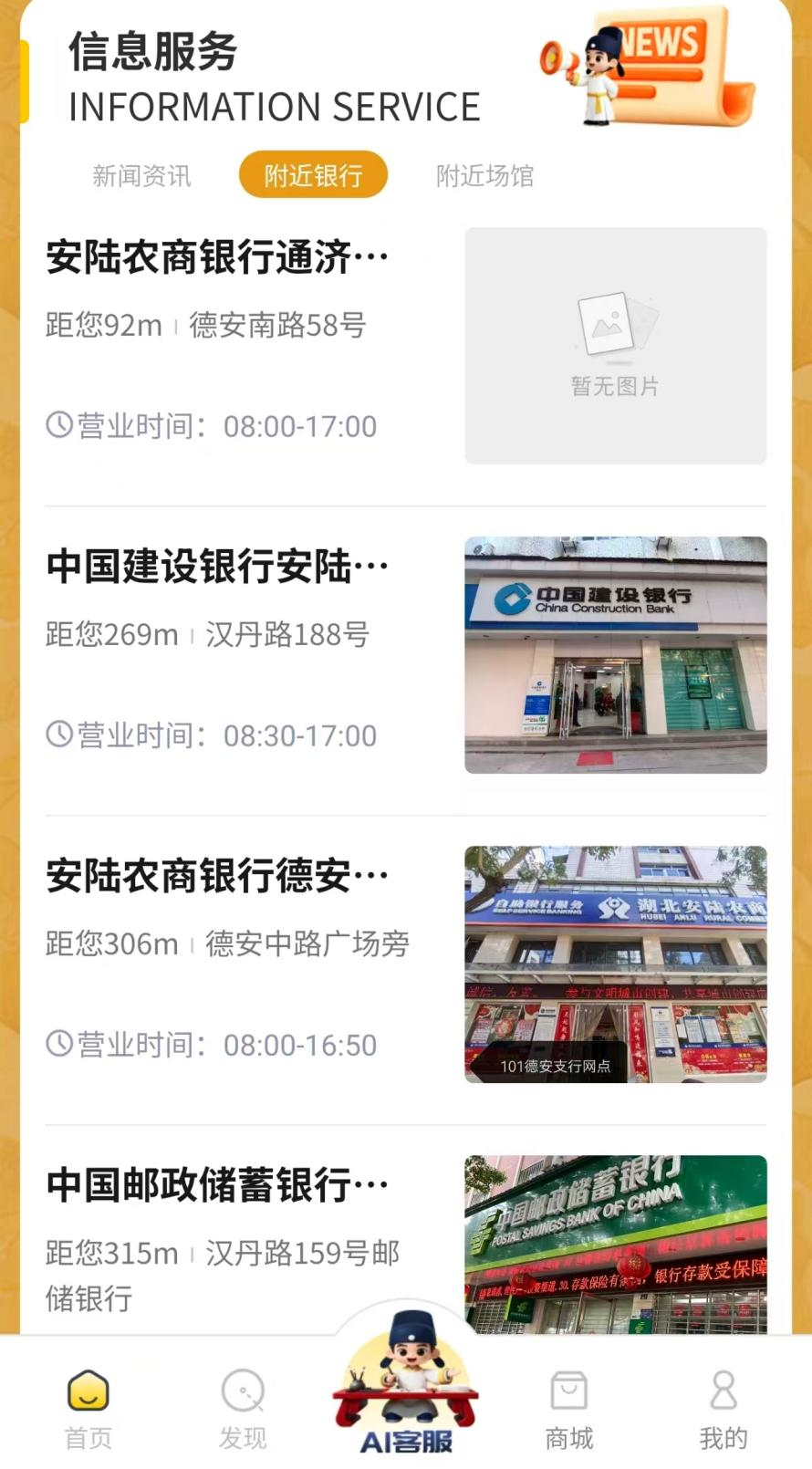 作为安陆市重点打造的智慧文旅服务载体,平台依托现代信息技术,将全市各类支付服务网点信息全面整合,形成“支付网点一张图”数字化服务矩阵。游客只需打开“一码游安陆”微信小程序,在首页的信息服务板块即可实时查看周边银行网点、助农取款点等位置分布、服务范围及运营状态,通过一键导航功能快速抵达,轻松满足现金取款、扫码支付、业务办理等各类需求,彻底告别“找网点难、支付不便”的出行困扰。
