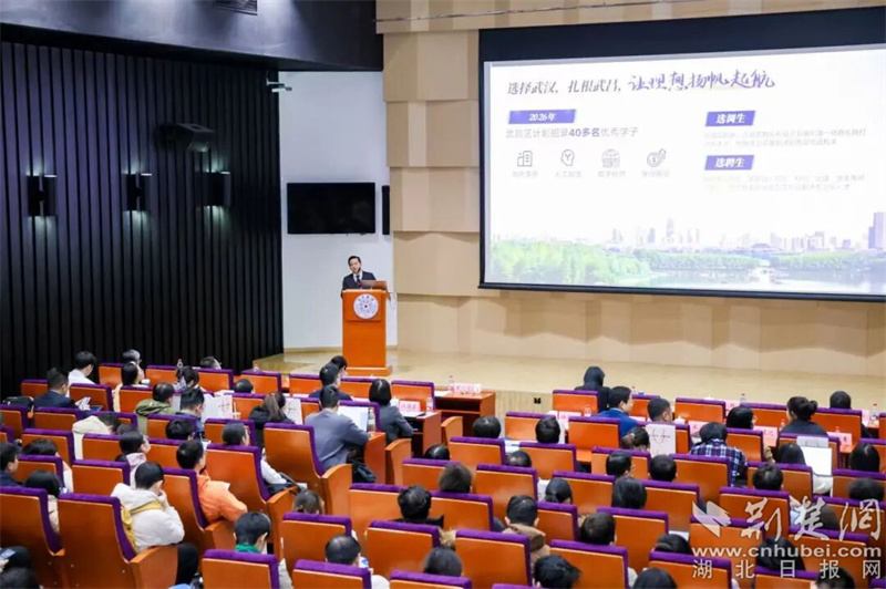 在用人单位推介环节,武昌区委常委、组织部部长施国宏以《三生有幸 筑梦江城》为题,从“历史底蕴”“现代产业”和“生态宜居”等维度,介绍了武昌作为武汉重要城区的独特魅力——从黄鹤楼的千年文化到长江沿岸的现代楼宇经济,从东湖绿道的生态长廊到“环沙湖经济带”的创新活力,一个开放包容、充满机遇的武昌形象吸引了在场众多学子。