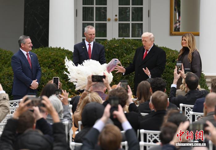 中新社华盛顿11月25日电 (记者 陈孟统)2025年美国感恩节即将到来,美国总统特朗普25日在白宫“赦免”两只感恩节幸运火鸡——“咯咯”(Gobble)和“晃晃”(Waddle)。