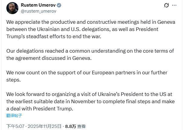 乌克兰国家安全与国防委员会秘书乌梅罗夫则于同日在社交媒体上公开表态称,美乌双方代表团已就在日内瓦讨论的协议的核心内容上,达成一致。