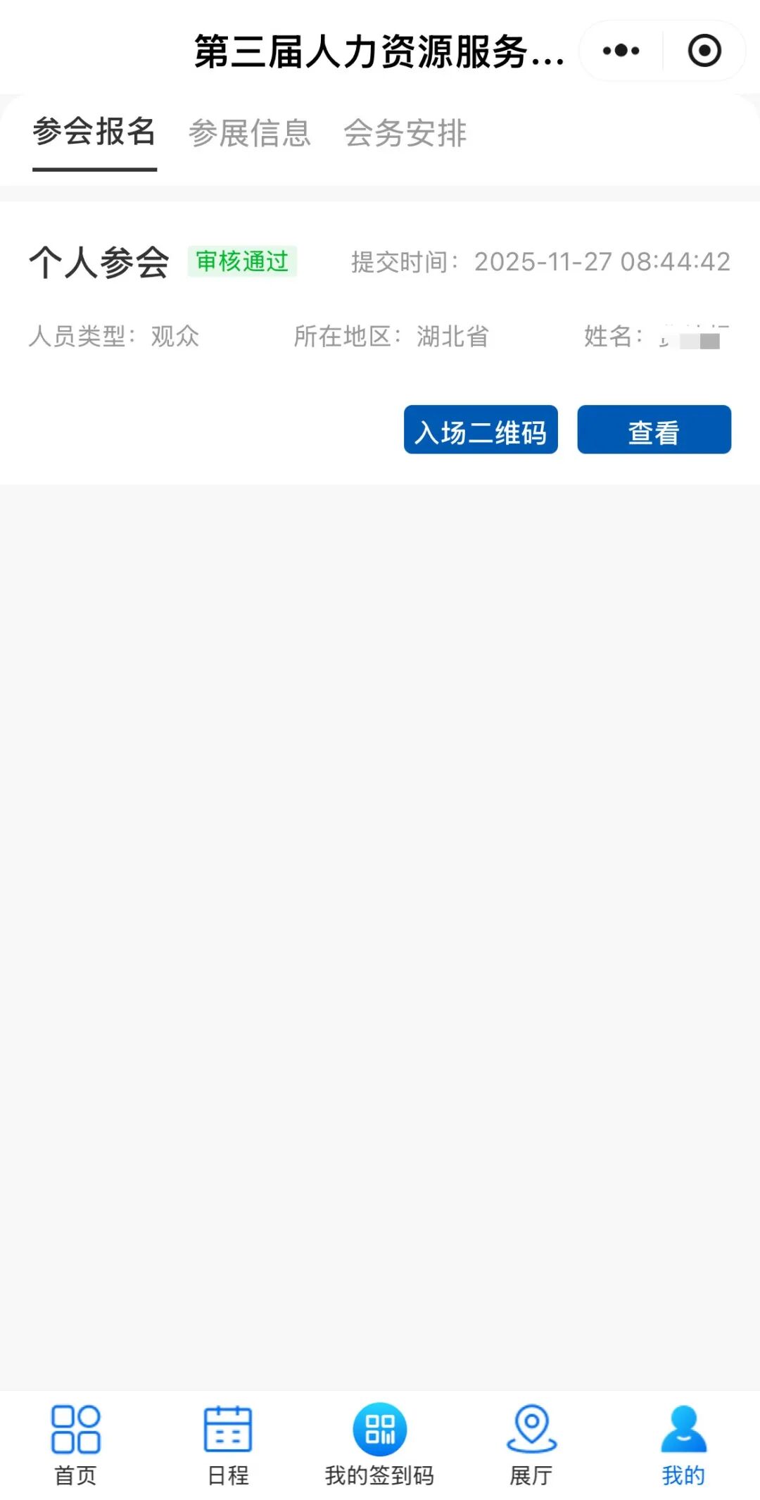 2.填写报名信息。依次输入人员类型、姓名、性别等内容后,点击提交按钮,即可报名成功,报名成功后,可在“我的签到码”中查看入场二维码及报名信息。