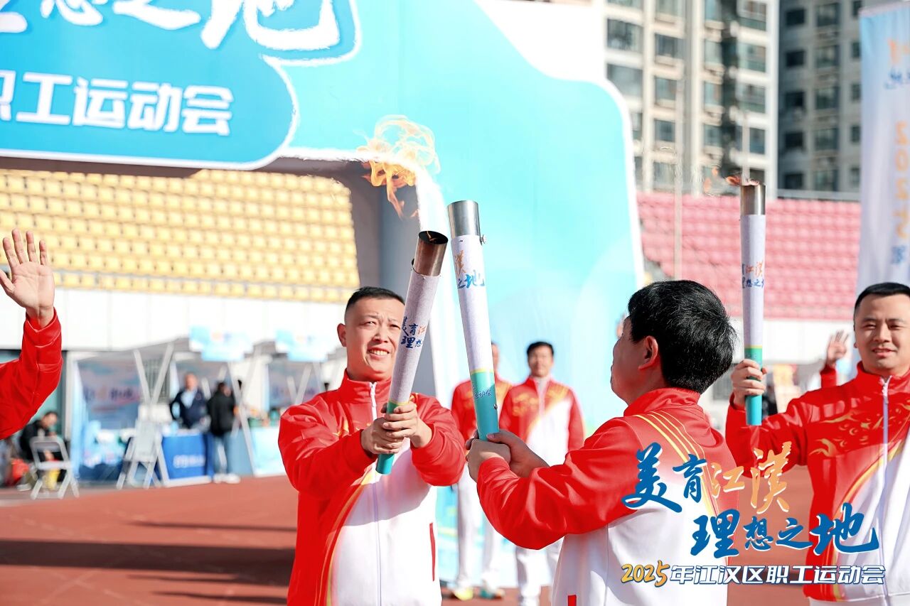 现场,“新兴之火”“数智之火”“金融之火”“枢纽之火”“人文之火”五棒火炬依次点亮,张裕、付俊、邵青、张宝剑、孟广松等15位劳模代表接力传递。燃烧的火焰,照耀着江汉区在科技创新、数字化转型、金融强区、商贸物流、文商体旅融合等发展领域坚定向前。当所有火炬手共同点燃主圣火盆,彩球腾空,全场沸腾,运动会正式开幕。