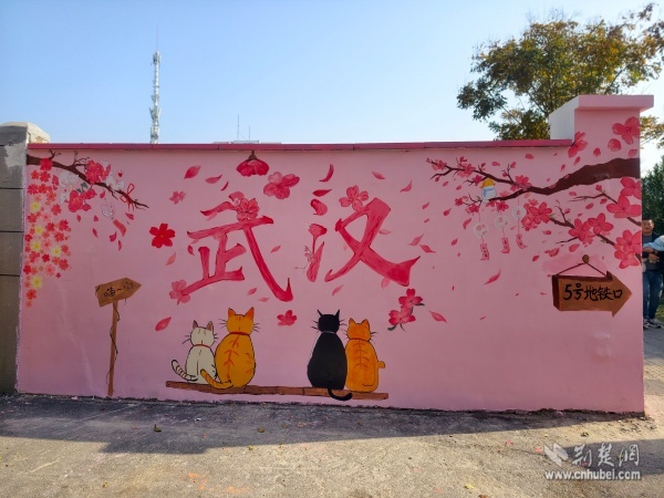 次日,创作进入精修阶段。志愿者们细致调整“武汉”字样的色彩饱和度,用粉白颜料层层晕染出飞扬的樱花花瓣。四只形态各异的猫咪相依蹲坐,灵动可爱;特意添加的“5号地铁口”指引牌等实用元素,更让作品兼具艺术性与功能性。创作过程中,不断有居民和游客驻足观赏,主动询问设计理念。“我们想通过樱花、猫咪等元素,展现武汉的浪漫与烟火气。”志愿者一边调色一边向围观群众讲解。