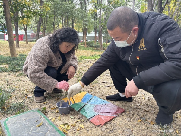 荆楚网(湖北日报网)讯(通讯员 阳华 陈勤)12月4日上午,武昌区黄鹤楼街道西厂口社区游园小路公园内色彩流转、暖意融融。为创新党员教育载体、活化社区文化空间,九龙井小区片区党支部在此开展了“手绘初心·共绘西厂——用艺术传递红色温度”主题党日活动,以彩绘为媒,将理论学习、文化传承与社区共建相融合。