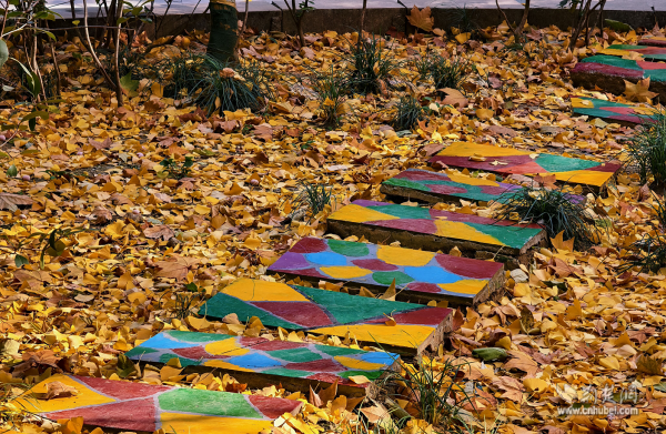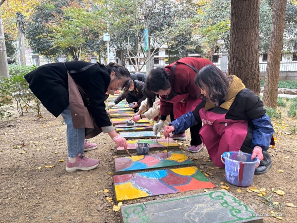 30余名党员与社区居民携手执笔,在社区能人的指导下,依据设计图稿细心勾勒线条,精心调配赭石、石青、石绿等传统矿物色彩,悉心填充花瓣、枝叶。草坪里原本素朴的地砖渐渐绽放出缤纷图景:象征革命精神的红色印记、勾勒武昌古城风貌的文化符号,以及依循“十二花令”铺陈的水仙、桃花、菊花等时令花卉与梅兰竹菊的清雅风骨艺术化呈现。