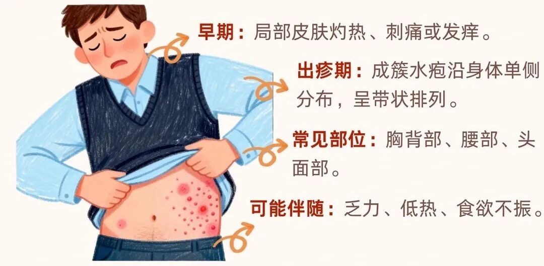 典型症状:出疹前常有皮肤灼热、刺痛或瘙痒等前驱症状,随后出现带状排列的红斑、水疱。其最显著的特点是皮疹通常局限于身体一侧,不超过中线。
