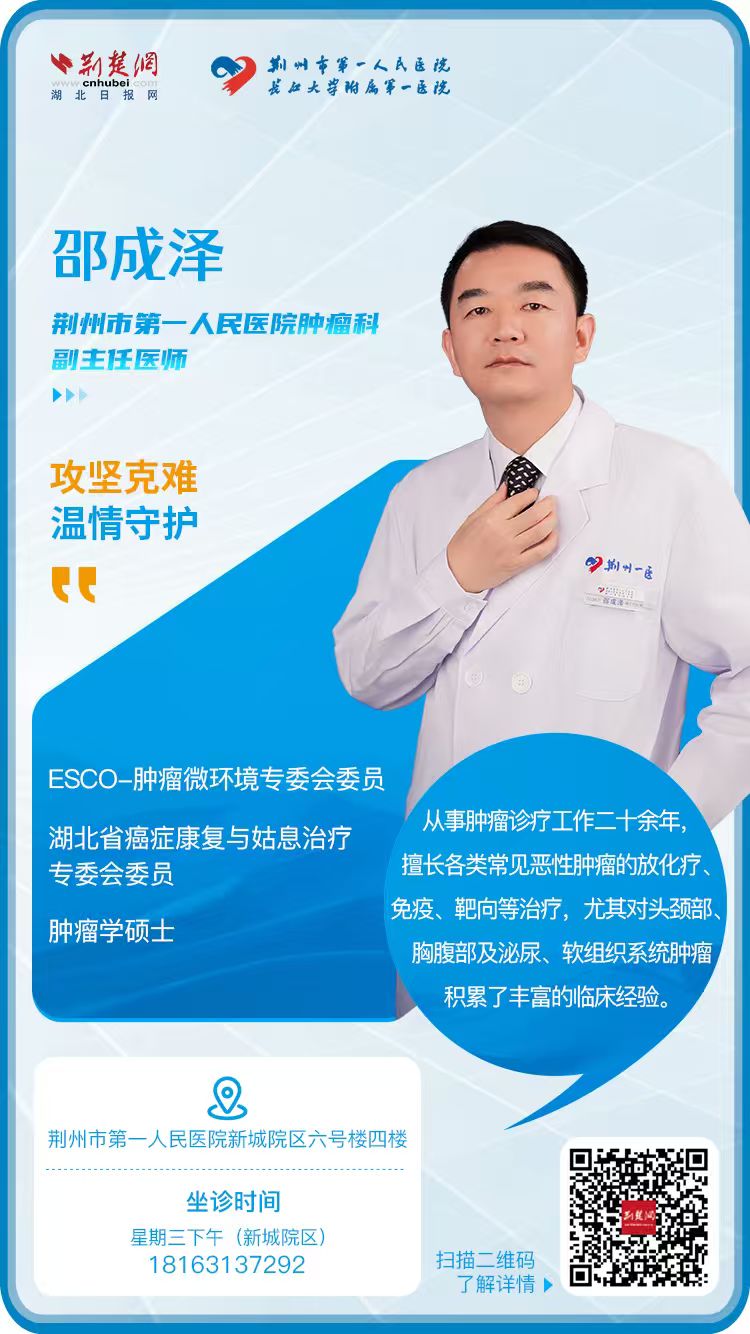 邵成泽:副主任医师,ESCO-肿瘤微环境专委会委员,湖北省癌症康复与姑息治疗专委会委员,肿瘤学硕士,从事肿瘤诊疗工作二十余年。