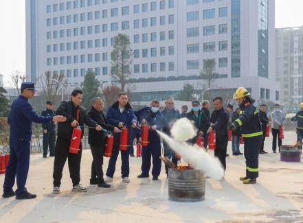 “提、拔、握、压,对准火焰根部……”灭火技能实操环节,消防宣传员现场示范教学,并指导参训的医护人员、后勤安保人员及观摩代表轮流操作手提式干粉灭火器(如图),成功扑灭模拟火点。