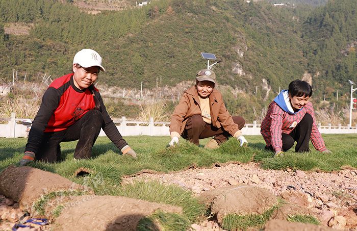 12月16日,巴东县沿渡河镇神农公园建设现场,工人们忙着铺设草坪、栽植绿化树,挖掘机挥舞长臂转运泥土,一派忙碌的建设景象。
