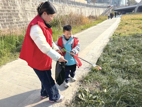 志愿者带着孩子一起清理河道垃圾。