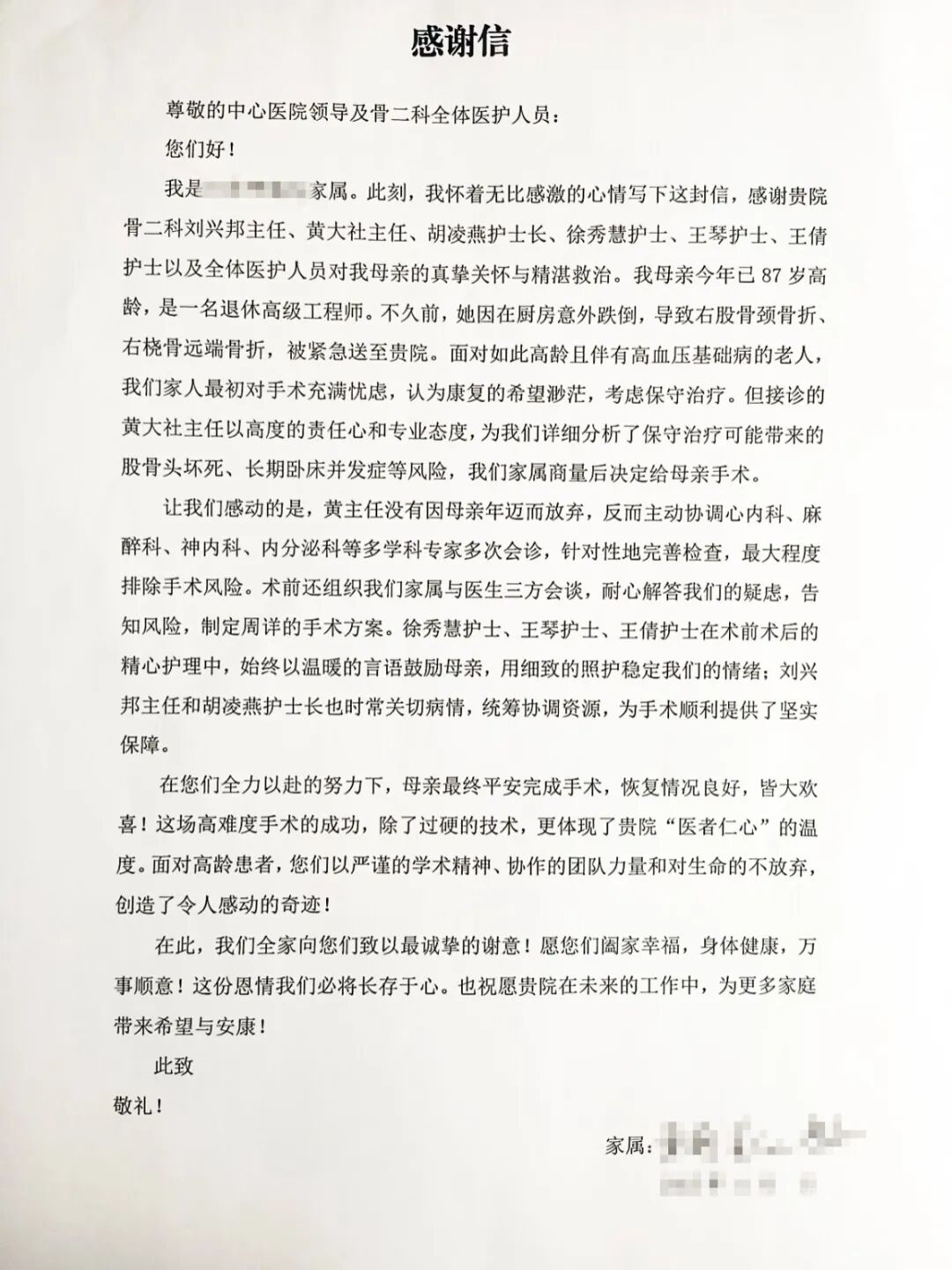 “是你们让我的87岁老母亲重新站了起来,更让她在这里感受到家一般的温暖,这份恩情我们全家铭记于心!”近日,李奶奶(化名)在家人陪伴下,精神矍铄地走出潜江市中心医院。临行前,家属将一封情真意切的感谢信,郑重交到医护人员手中。