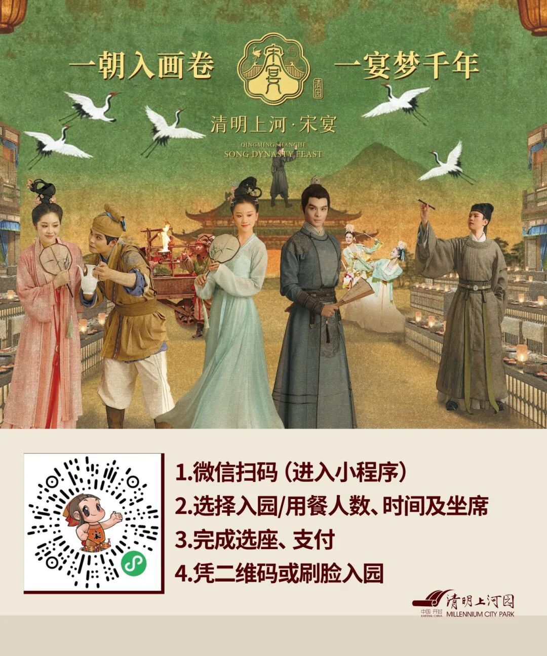 一朝入画卷,一宴梦千年。清明上河园将围绕宋文化继续创新,深入挖掘,带来更多令人耳目一新的旅游产品。《清明上河·宋宴》期待与您执笔入画,再续风雅!品人间至味,悟大宋清欢。查看下图,预约入宴!赴一场风雅与市井的千年之约。