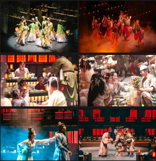 《清明上河·宋宴》沉浸式餐秀,以“活态宋式风雅”为主题的全景沉浸式宴演,通过“宴席+演艺+科技”的创新形式,让游客化身北宋汴京雅士,跟着宋代名人的脚步风雅入宴。八幕十场,演绎大宋生活美学,从序章《菊盏流光》的茶香菊影,到终章《东京梦华》的市井烟火,让游客充分感受“食不厌精 脍不厌细”的宋式饮食哲学。