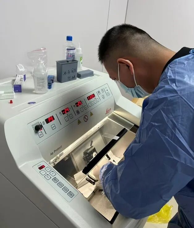 据悉,此次首例术中冰冻诊断的顺利开展,源于病理科团队的提前统筹与精细化筹备。在接到东城院区手术快速预约需求后,科室第一时间启动协同机制:诊断医师吴建山提前一天完成全流程预演,确保诊断环节无缝衔接;技术组李蓓、卢珂清晨到岗,对切片机、质控试剂等关键设备进行全面预热与调试,为标本处理的高效性和准确性筑牢基础。