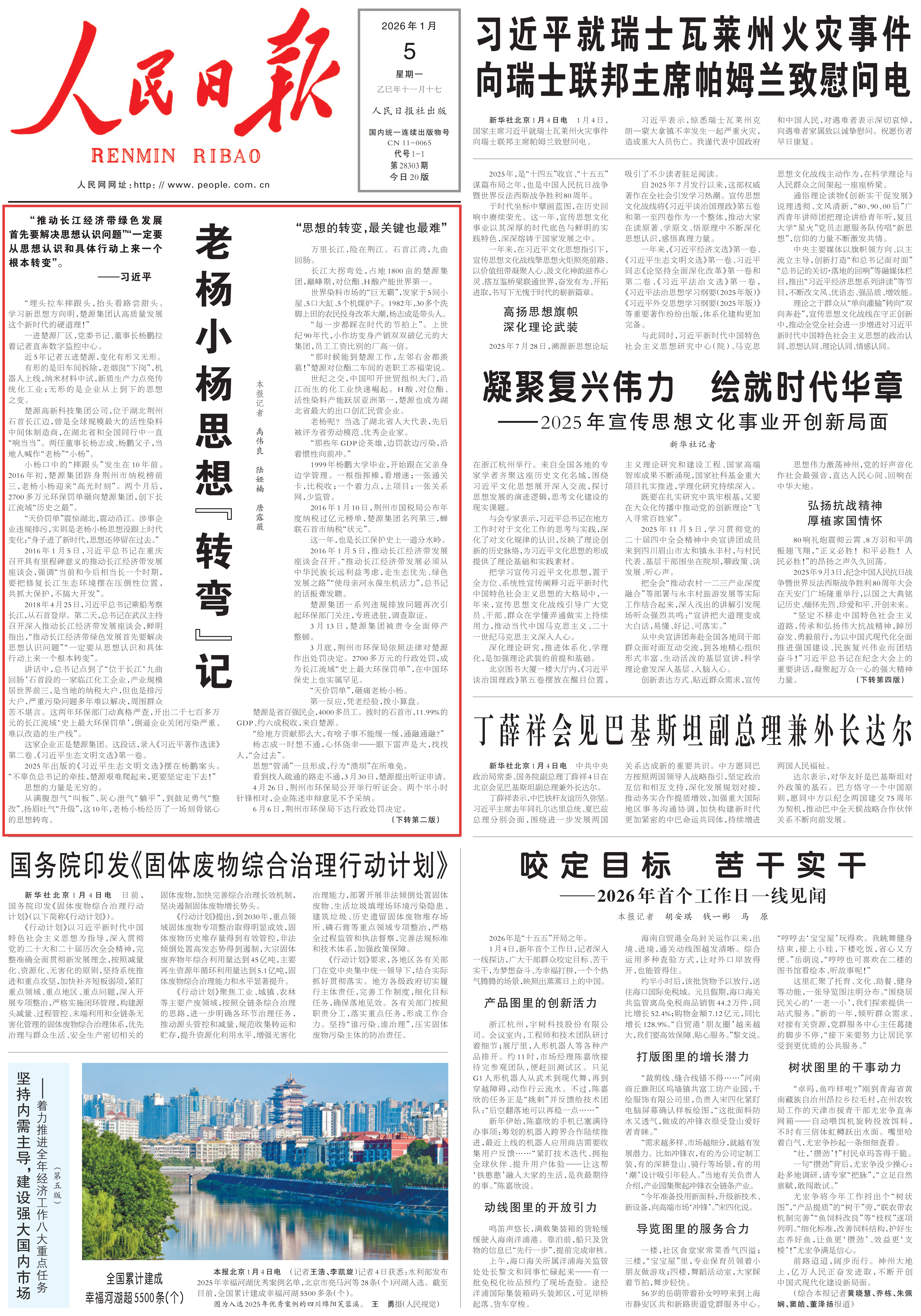 今天是“长江大保护”提出十周年。人民日报在头版正头推出《老杨小杨思想“转弯”记》,聚焦长江之畔的湖北楚源高新科技集团公司,讲述两任董事长老杨、小杨父子在“共抓大保护,不搞大开发”理念引领下,实现思想转变,推动企业绿色转型与高质量发展的故事。