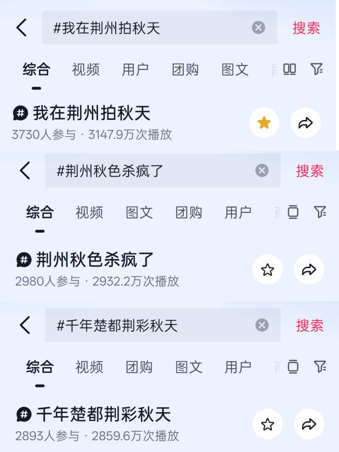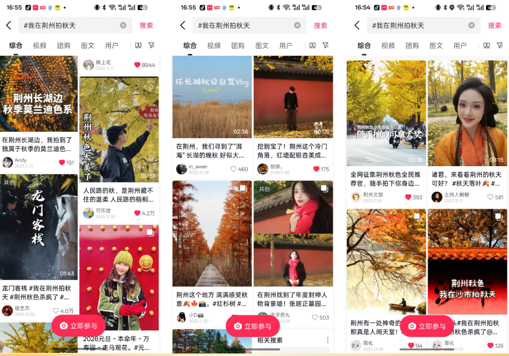 截至2025年12月15日,活动取得瞩目成效。#我在荆州拍秋天、#荆州秋色杀疯了、#千年楚都荆彩秋天 三大主话题在全平台总播放量突破1亿,吸引超过10000名创作者热情参与,投稿作品覆盖荆州市8个县市区及3个功能区,全民赏秋、全民荐秋成功将荆州的秋日盛景推向了全国。本次大赛秉承“公平、公正、公开” 原则,评选出以下获奖博主: