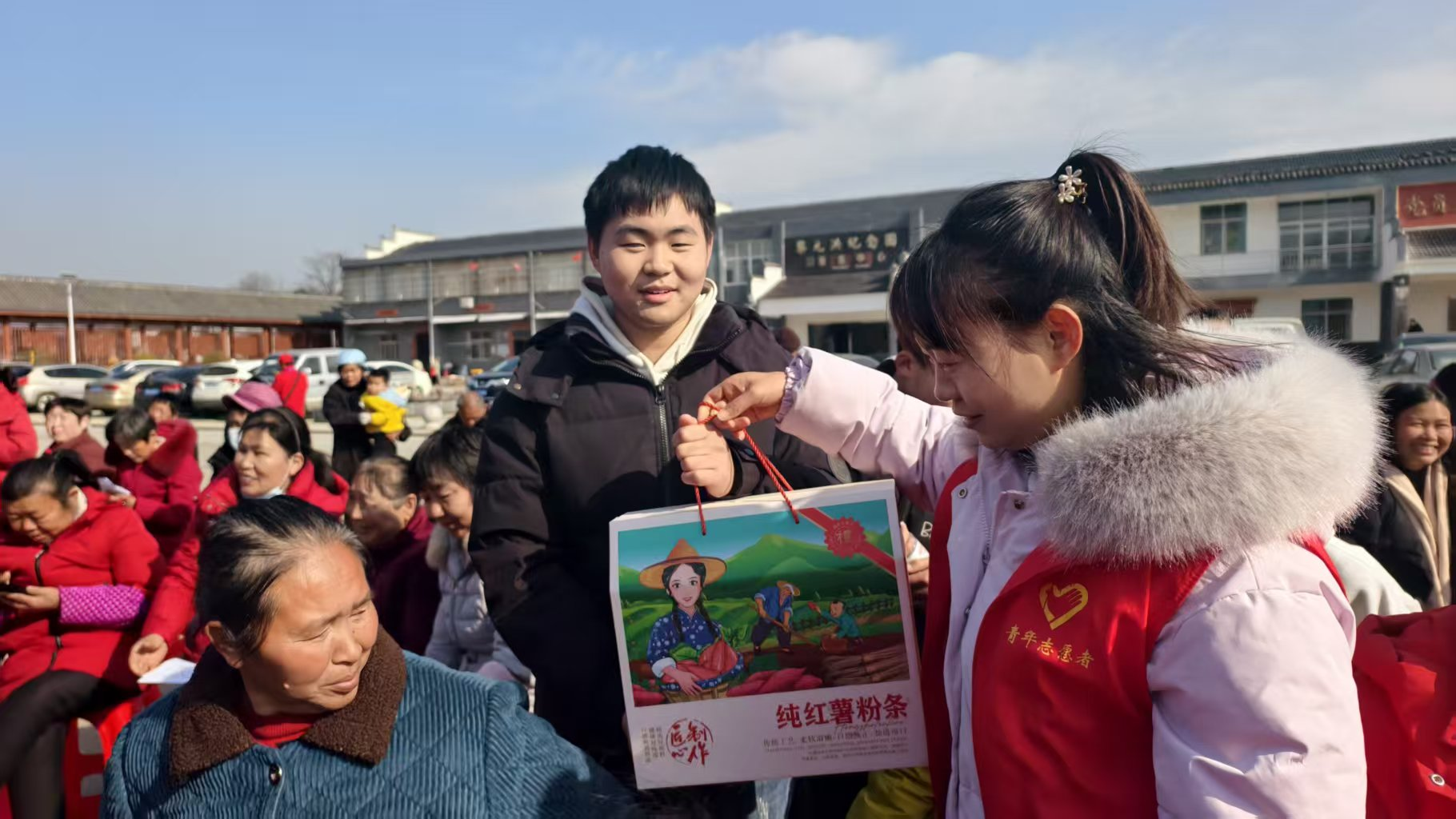 村晚中穿插贴近生活、关乎文明的知识有奖问答,引得台下村民抢答,答对的村民不仅收获了文明常识,还赢得了一份份春联和福字,或者本地特产“年货大礼包”。