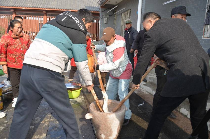 舞台一侧是“彭店好物”农产品展销台,彭店乡的大米、生态禽蛋、手工粉丝、花生等特色农产品琳琅满目,人头攒动,大家纷纷选购自己喜欢的年货,最吸引的人是游客与村民一起打糍粑,品尝自己亲手打出来的糍粑,体验乡村浓浓的年味,一场文旅盛宴带动彭店土特产品出圈出村。
