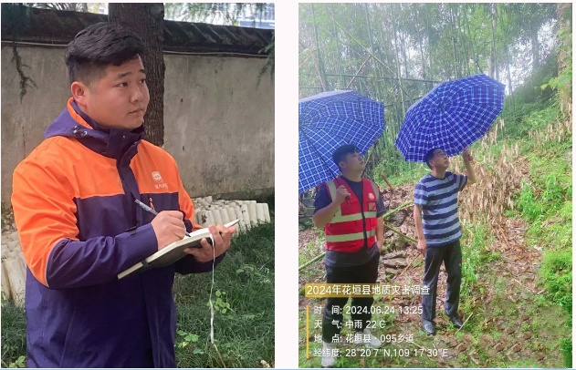 2024年,在湖南省花垣县,胡明曾通过现场裂缝和雨量监测数据,预判一处滑坡风险,并紧急建议撤离住户。当晚滑坡发生,民房后墙被掩埋,因撤离及时,无人伤亡。
