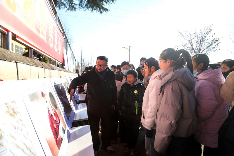 在高镇城中心学校,老师结合展出照片给学生们讲解农耕文化。