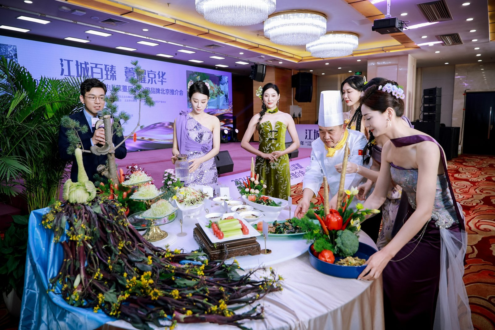 活动现场,《千年一“薹”,京诚所爱》情景剧生动诠释洪山菜薹的传承与创新,产品走秀与艺术插花表演凸显其美学价值,楚菜名厨现场演绎“一薹多吃”宴席,展现菜薹融入京鄂风味的烹饪创意。京城网红大厨隋坡登台品鉴,为洪山菜薹实力“打call”。现场同步设置国风市集,展出鲜薹、锁鲜产品及礼盒,供嘉宾品鉴体验。