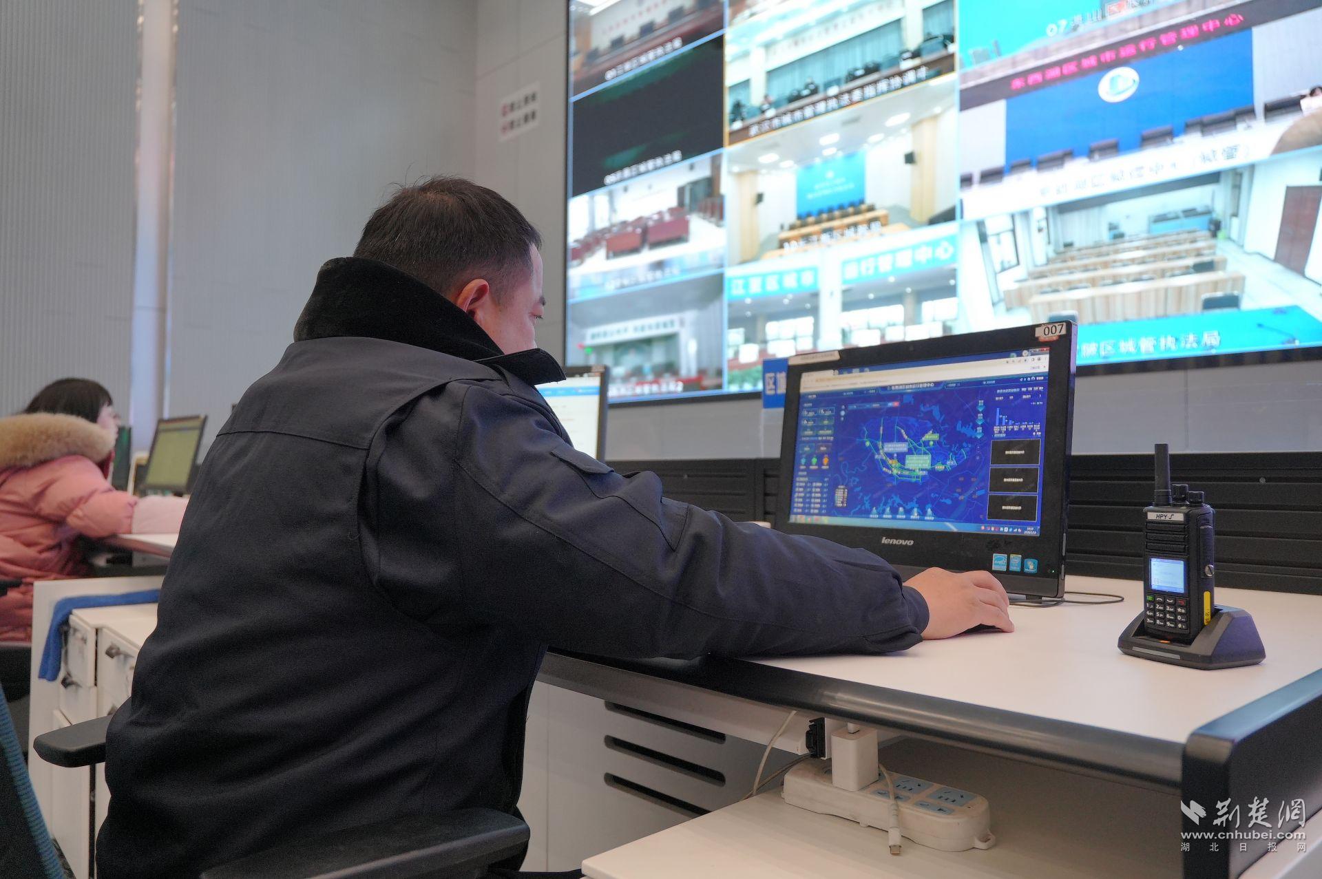 这是东西湖区本轮应对低温雨雪冰冻天气的指挥中枢。调度大厅内,一套新升级的融雪防冻智慧应用正在运行:天气变化、人员物资、道路状态在同一平台集中呈现,重点路段通过视频轮巡实时监控,必要时可启用无人机辅助巡查,实现对主干道路、桥梁、学校和商圈周边的动态掌控。