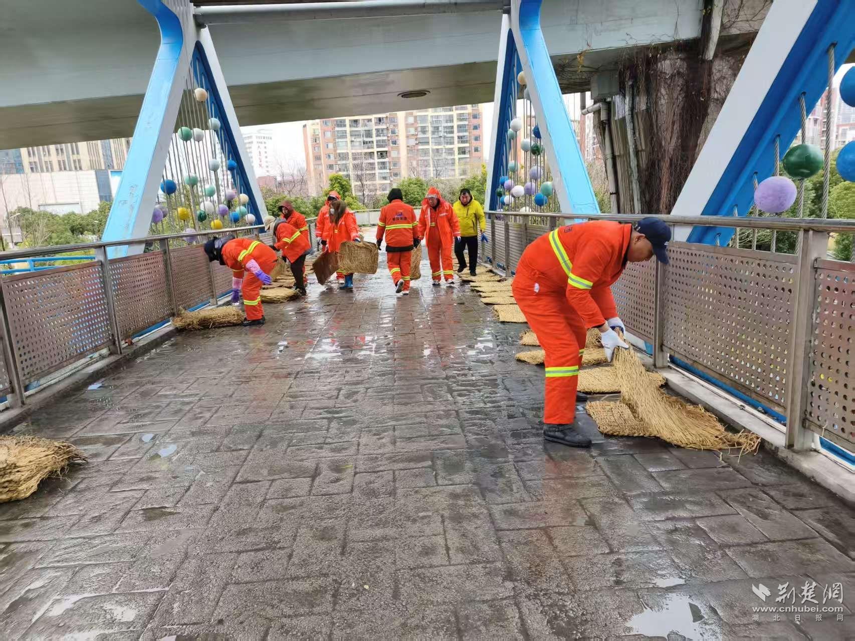 防滑措施同样向行人集中区域延伸。19日17时起,吴家山环山路人行天桥上,环卫工人与执法队员开始铺设防滑草垫。“桥两侧是学校,晚高峰和早高峰人流集中,提前铺设能减少滑倒风险。”吴家山街综合执法中心副主任陈伟说。