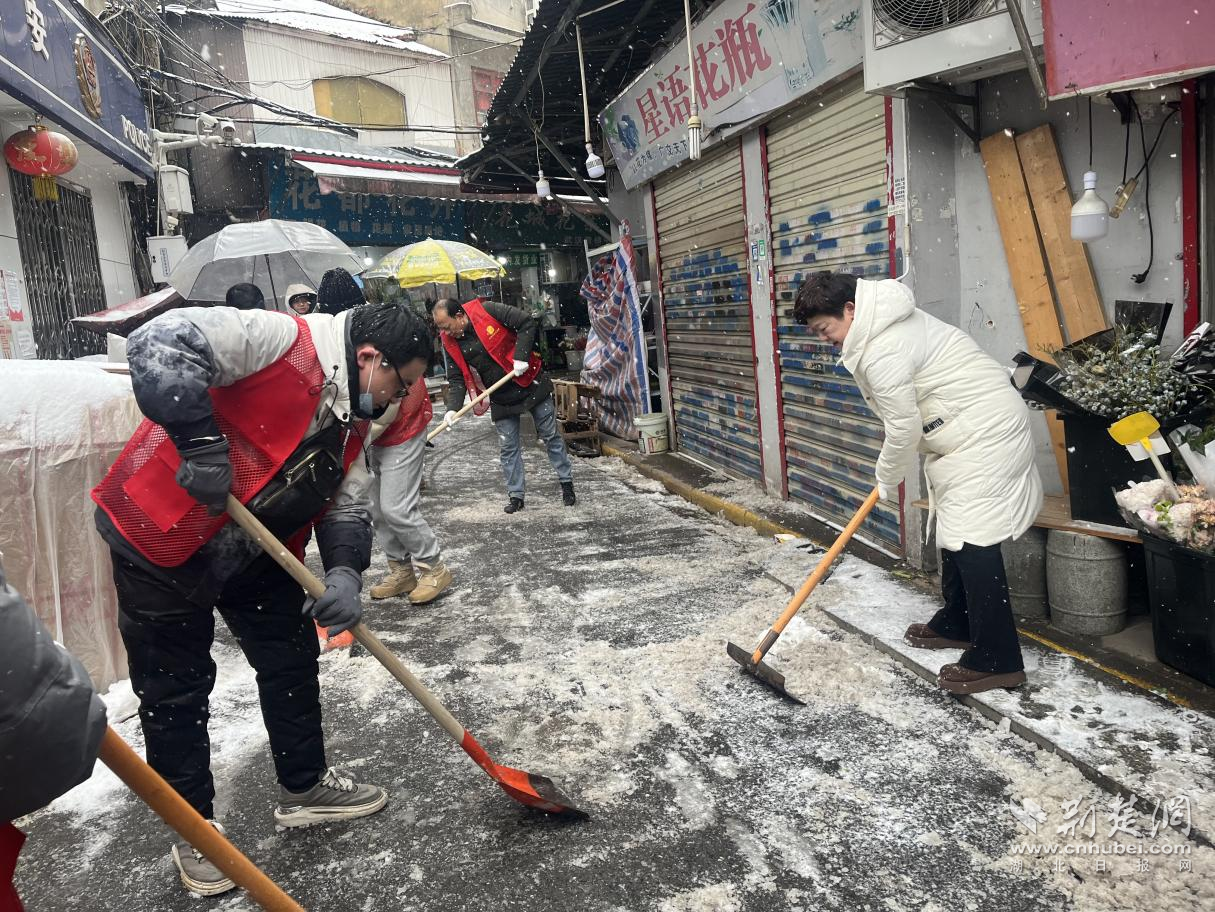 当天清晨,清雪人员已在辖区出行要道、社区小巷等多个点位同步作业。街道机关干部带队下沉一线,来自辖区的多支力量陆续到位。江汉区科学技术协会、区湖泊管理所等单位党员积极参与行动;新华路体育中心、南国中心等单位也主动对接,纷纷派出人员和工具协同作业。