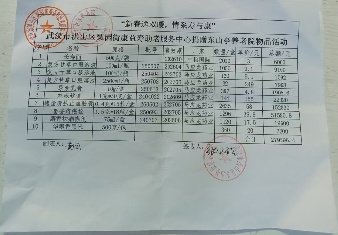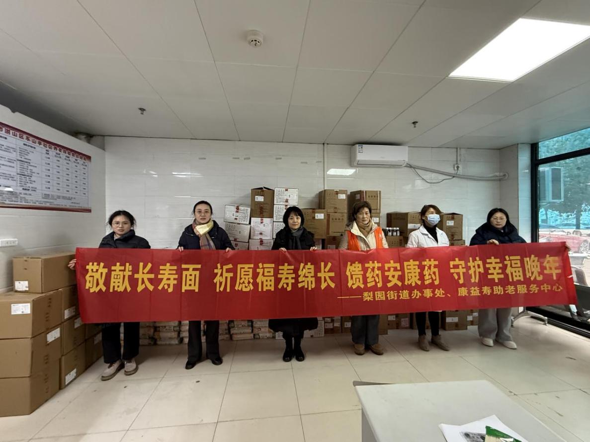 当日,梨园街道办事处主任张笑与康益寿工作人员顶风冒雪,将满载关怀的10箱大米、2000袋面条及一批常用药品,总价值为27.95964万的物资送达到东山亭社区养老院。近期寒潮叠加降雪,该院内高龄、失能老人人数较多,物资储备面临压力。“这批物资来得太及时了”,院长接过物资时连连感谢,“不仅是雪中送炭,更是给了我们度过严寒的底气。”