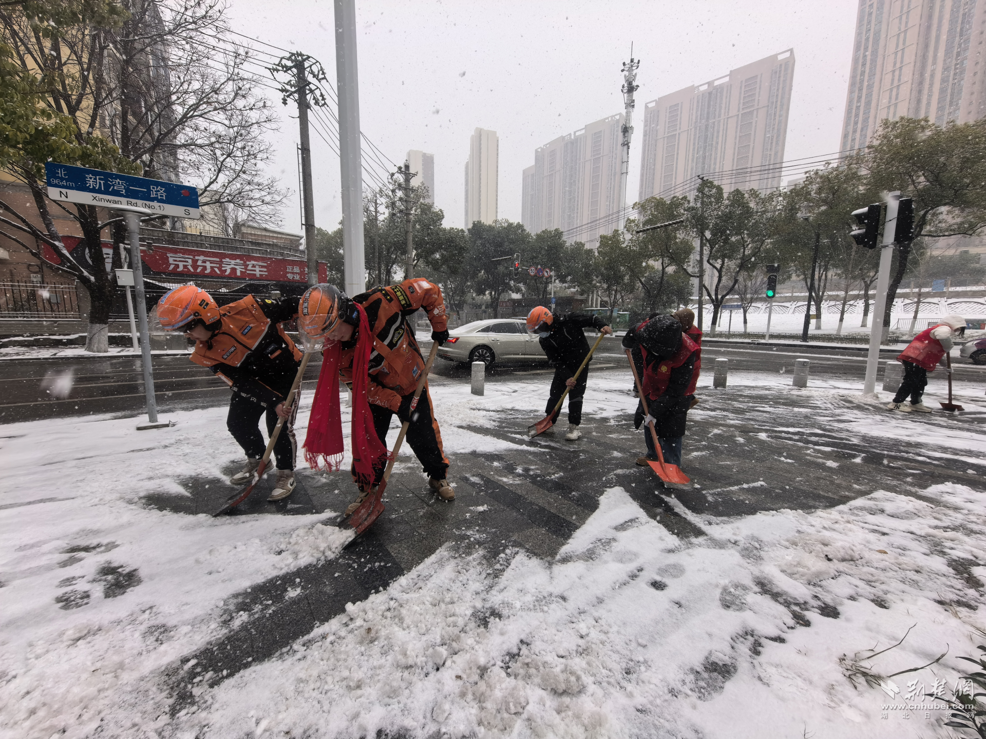 随着降雪持续,各街道迅速把新兴领域党员、职工和新就业群体动员到扫雪除冰一线。