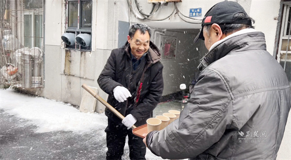 “大家歇一歇,喝点姜茶暖暖身子!”正当众人干劲十足时,一位党员居民端着热气腾腾的姜茶走来,将暖茶递到每个人手中。“我家老伴重症需要照顾,没办法和大家一起出力,只能煮点热茶让大家暖和一下。”一杯姜茶、一声问候,凝聚起邻里间最真挚的情谊,为扫雪行动更添温情。